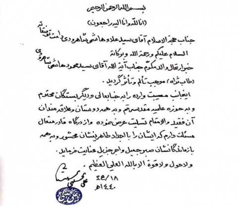 حضرت آیتالله سید علی سیستانی پیامی به زبان فارسی به حجت الاسلام سید علاء هاشمی شاهرودی فرزند حضرت آیتالله سید محمود هاشمی شاهرودی فرستادند.