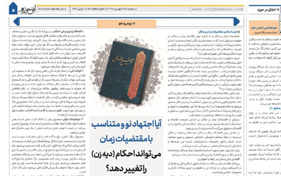 تصدیع میدهد: در شماره 10585، سال هفدهم مورخ دوشنبه 19 فروردین 1398، در صفحه 5، با خط برجسته چنین آمده بود: «آیا اجتهاد نوین و متناسب با مقتضیات زمان میتواند احکام (دیه زن) را تغییر دهد».