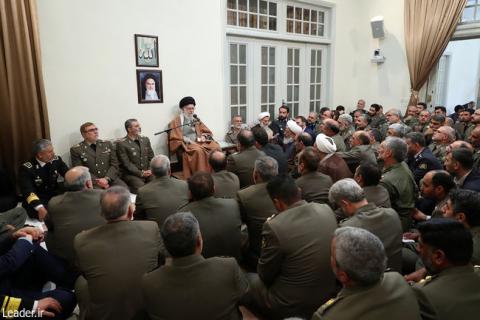 رهبر انقلاب اسلامی، نیروهای مسلح را در منطق اسلام و جمهوری اسلامی، «حصارهایی امن برای ملت» برشمردند و افزودند: نیروهای مسلح در زمان جنگ، در مقابل تهاجم دشمن با دانش، تجربه و فداکاری، سینه سپر و آن را منکوب و وادار به عقب نشینی میکنند و در زمان صلح نیز با کارآمدی و آمادگی کامل، مایه اطمینان و آرامش خاطر ملت هستند، و به همین دلیل، دشمنان به دنبال بر هم زدن آرامش مردم از طریق مضطرب نشان دادن نیروهای مسلح هستند.