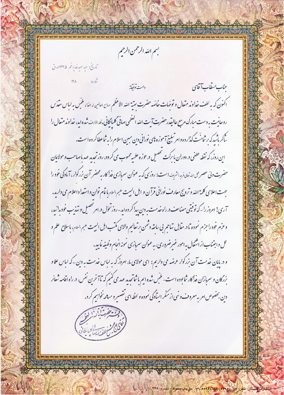 «اکنون که به لطف خداوند متعال و توجّهات خاصّه حضرت بقیة الله الاعظم ارواح العالمین له الفدا، ملبّس به لباس مقدّس روحانیت به دست مبارک مرجع عالیقدر حضرت آیت اللّه العظمی صافی گلپایگانی مدظله الوارف شده اید، خداوند متعال را شاکر باشید که بر شما منّت گذارده و امر تبلیغ آموزه های نورانی دین مبین اسلام را به شما عطا کرده است.