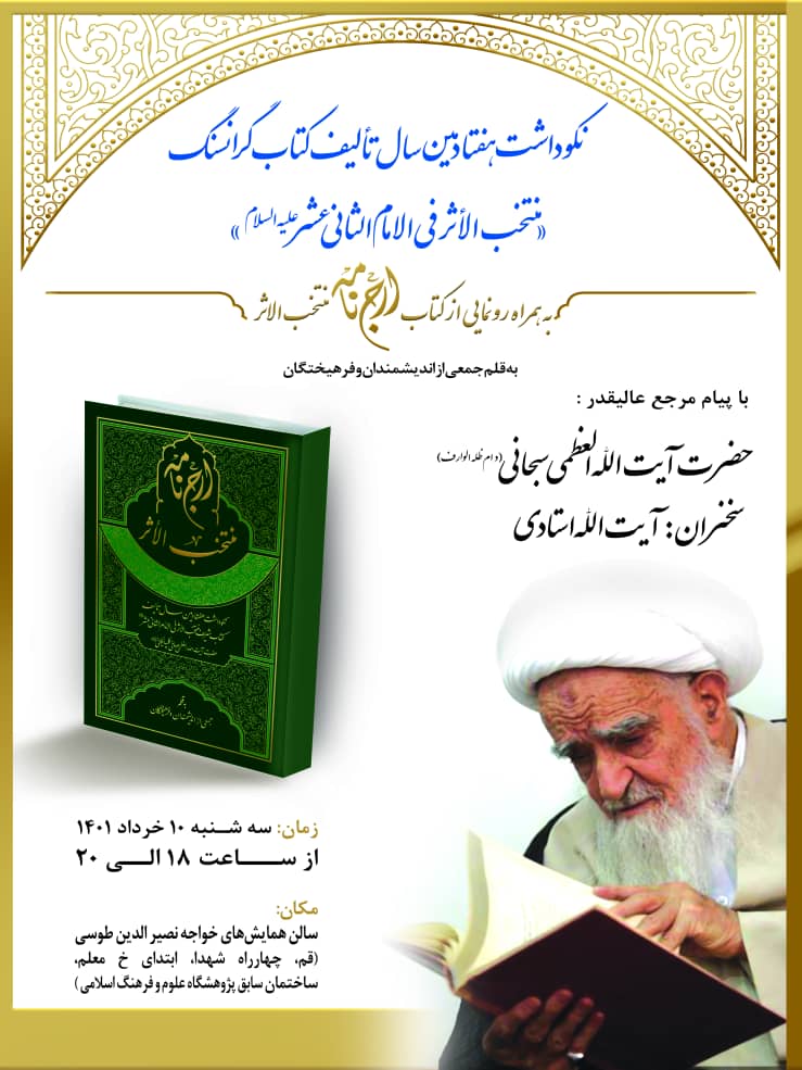 نکوداشت این کتاب روایی شریف، تعظیم امر حضرت علیه السلام است و با لطف خداوند و عنایات خاصه حضرت ولی عصر علیه السلام همایش نکوداشت هفتادمین سال تألیف این کتاب ارزشمند، روز سه شنبه 10 خرداد با پیام مرجع عالیقدر حضرت آیت الله العظمی سبحانی دام ظله العالی و سخنرانی آیات عظام و حجج اسلام: آقایان استادی، صافی گلپایگانی، مهدیپور و احمدی تهرانی از ساعت 18 الی 20 در تالار همایشهای خواجه نصیر الدین طوسی به آدرس چهارراه شهدا قم، ساختمان قدیم پژوهشگاه علوم وفرهنگ اسلامی(روبروی دفتر تبلیغات اسلامی) برگزار میگردد و انشاءالله از مجموعه ارزشمند «ارج نامه منتخب الأثر» با حضور اساتید و دانشمندان ارادتمند به حضرت ولی عصر ارواح العالمین له الفداء رونمایی خواهد شد.